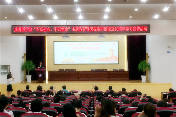 2019年6月14日,学校开展“不忘初心、牢记使命”主题教育暨庆祝新中国成立70周年学习宣传活动,此次活动活动结合由成都市妇女联合会主办,成都市女知识分子联合会、成都医学院承办,新都区妇联协办的“巾帼心向党 建功新时代”优秀女性巡讲活动开展。四川省三八红旗手、四川省名中医、成都中医药大学张虹教授紧紧围绕“大医精诚敬业奉献”这一主题开展专题讲座,通过分享与国医针灸结缘36年的精彩故事,传递新时代奉献巾帼力量精神。