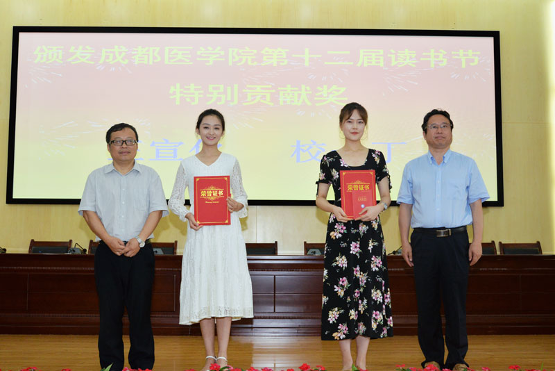 “2018全国大学生中华经典美文诵读大赛”一等奖获得者王宣化同学、“图书馆杯四川全民英语口语大赛”中荣获特等奖的校一丁同学,获本届读书节特别贡献奖,并获赠成都医学院图书馆“终身读者”荣誉。樊均明校长、党跃武秘书长颁发读书节特别贡献奖证书、“图书馆杯四川全民英语口语大赛”特等奖奖品。校领导、相关部门负责人为获奖者颁发荣誉证书。颁奖环节掌声雷动,共庆本届读书节圆满落下帷幕。大家相约下一届读书节,为阅读之风溢满校园砥砺前行!