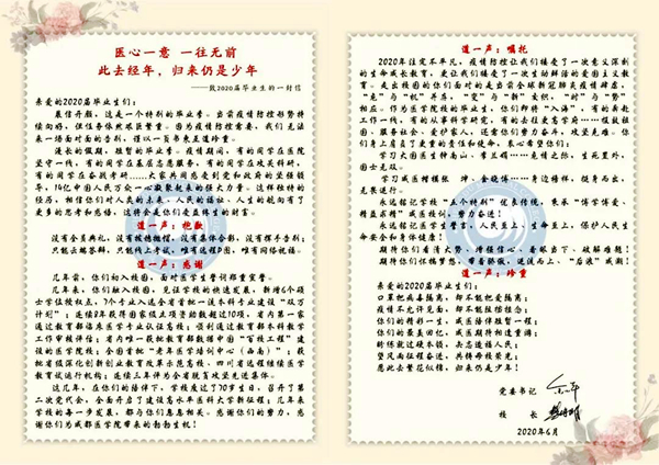 2020年注定不平凡,疫情防控让我们接受了一次意义深刻的生命成长教育,更让我们接受了一次生动鲜活的爱国主义教育。走出校园的你们面对的是当前全球新冠肺炎疫情肆虐,“危”与“机”并存,“变”与“新”交织,“时”与“势”相应。作为医学院校的毕业生,你们即将“入海”,有的奔赴工作一线,有的从事科学研究,有的去往更高学府……报效祖国、服务社会、爱护家人,还需你们努力奋斗,攻坚克难。你们身上肩负了更重的责任和使命,衷心希望你们: