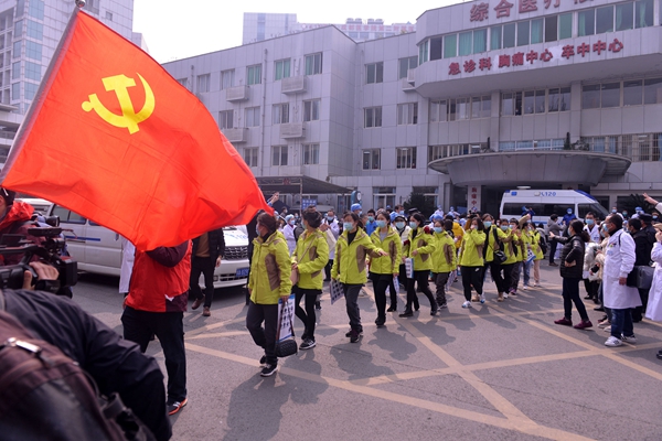“我们庄严宣誓:坚决听党指挥,把人民健康放在首位……全力以赴,坚决打赢疫情防控阻击战,圆满完成党和人民赋予的光荣使命!”2月13日,成都市第五批抗击新冠肺炎援鄂医疗队出征仪式上,在该医疗队临时党支部书记李彦的领誓下,队员们高举右拳,庄严宣誓。