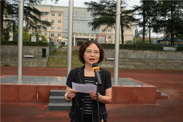 校党委书记余小平在国旗下讲话。她说,举行开学升旗仪式,既是要欢迎全校师生安全按时返校,也是要在国旗下开展一次全校性的爱国主义教育活动。