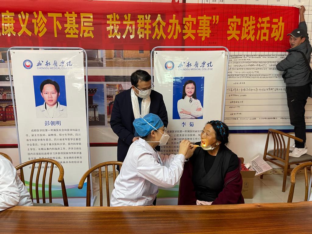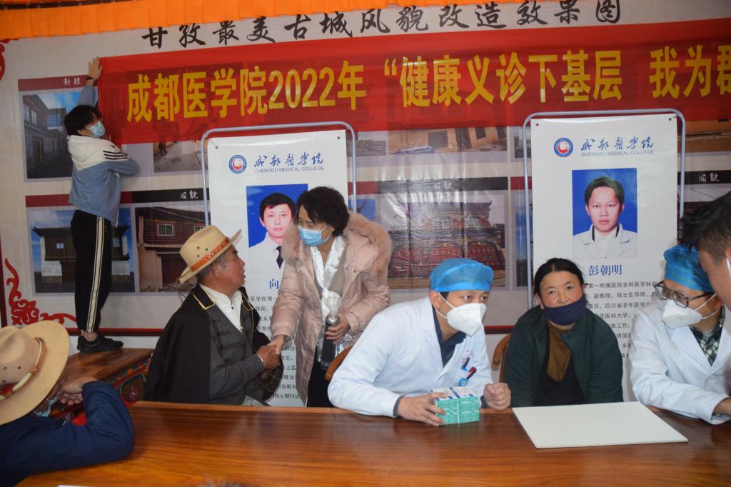 在甘孜县城北一村,成都医学院医疗专家团和统一战线专家团“健康义诊下基层,我为群众办实事”实践活动顺利举行。来自学校临床医学院、第一附属医院的口腔医学、全科医学、骨科和妇科专业的医疗专家们,用精湛医术在义诊现场为当地老百姓送去关心关爱。在一个半小时的时间里,候诊群众有序排队,医疗专家们认真仔细地给村民测量血压、检查身体,问询病情,查看病历,排忧解难,切实提升群众的获得感、幸福感和满意度。经统计,参加现场义诊义检群众110余人,发放药品累计价值2000元。