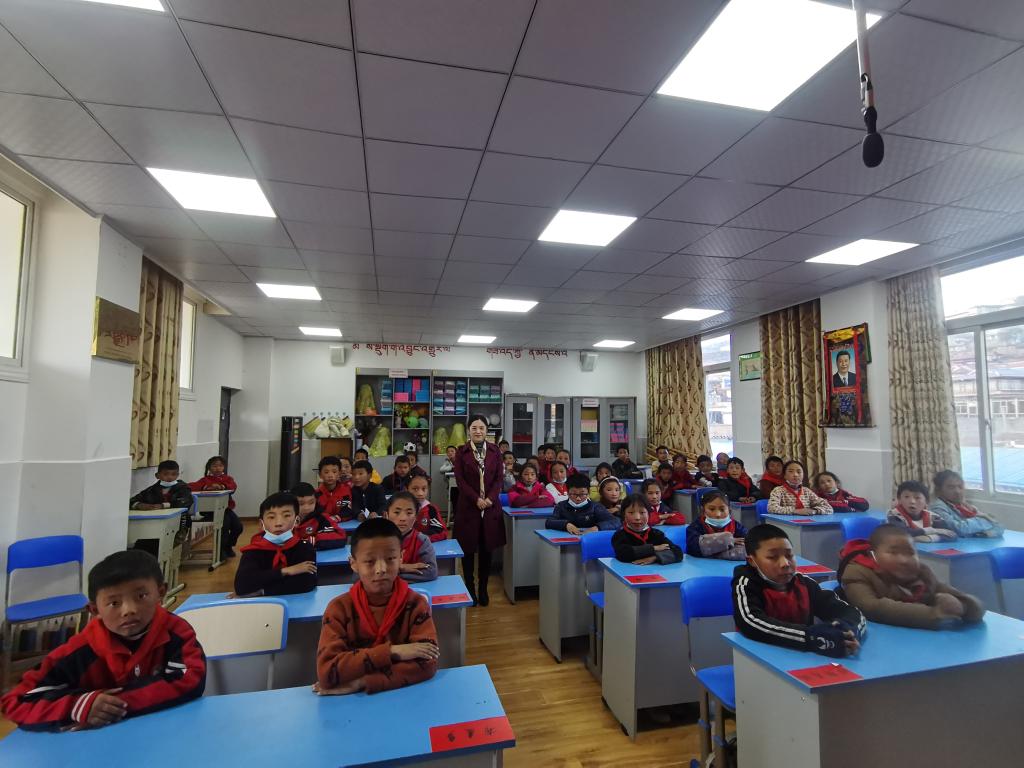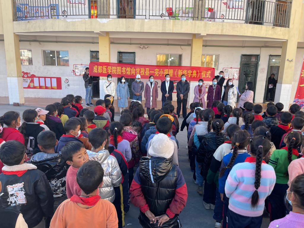 在甘孜县城北第一完全小学,党委常委、副校长王计生,党委常委、党委组织部部长江先文,党委教师工作部、人事处处长代敏,图书馆工作人员等一行8人,为该校2年级的学生捐赠《新华字典》110册,甘孜县教育和体育局,一完小师生参加了活动。