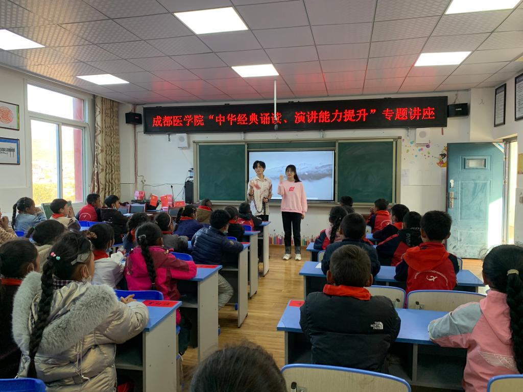 马克思主义学院副教授袁景老师带领2名在校大学生,在甘孜县城北第一完全小学,为该校的师生开展了经典润乡土“中华经典诵读 演讲能力提升”专题讲座,通过教孩子们如何说好普通话、并推广普通话的重要价值意蕴,鼓励孩子们勤奋学习,改变生活。袁老师从提问梦想开始,以亲切自然的方式迅速和孩子们熟络起来,台下的孩子们积极踊跃地举手发言,有一个孩子大声说出“我想当医生!”讲座最后环节,由袁老师指导学校药学院大三学生易义、杨敏带来的朗诵表演《可爱的中国》。通过“讲和演”相结合的方式生动地开展讲座,激发了山区孩子们对普通话的学习热情,让专题讲座的效果更加有说服力和吸引力,赢得了现场师生热烈的掌声和点赞。
