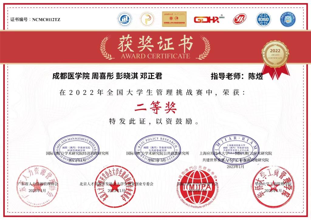 近日,2022年全国大学生管理挑战赛落下帷幕。由我校大健康与智能工程学院2020级公共事业管理专业学生周喜彤、彭晓淇、邓正君三位同学组成的成都医学院代表队获得此次比赛二等奖。